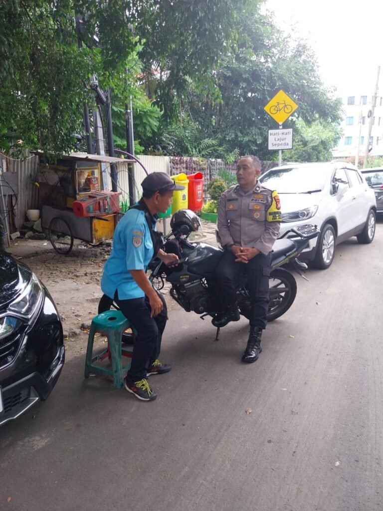 Bhabinkamtibmas Kelurahan Melawai, Aiptu Iswahyudi, melaksanakan kegiatan sambang dan patroli di lingkungan RW 02. Dalam kesempatan ini, beliau bertemu dengan juru parkir, saudara Warso, untuk melakukan bincang-bincang santai.