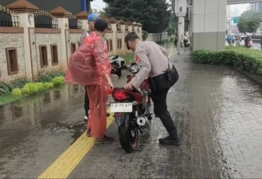 Saat melintas di depan *Kantor Lantas, Jl. MT Haryono RW. 02, Kelurahan Cikoko, Kecamatan Pancoran, Kanit Samapta Iptu Nurkholis melihat , pengendara motor bernomor polisi **B 6108 KPP*, tampak kesulitan menghidupkan kendaraannya di tengah hujan deras. Motor tersebut mati total atau mogok.