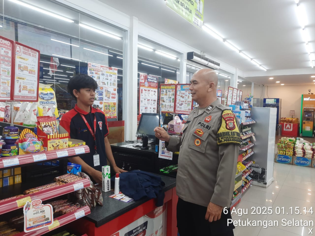 Jakarta Selatan – Guna menjaga situasi kamtibmas tetap kondusif, Polsek Pesanggrahan melalui Bhabinkamtibmas Kelurahan Petukangan Selatan, Aiptu Dasep Hidayat, melakukan pemantauan terhadap minimarket yang beroperasi selama 24 jam yang berlokasi di Jalan Damai RT.003/005, Kelurahan Petukangan Selatan, Kecamatan Pesanggrahan, Jakarta Selatan, Rabu (6/8/2025) dini hari.
