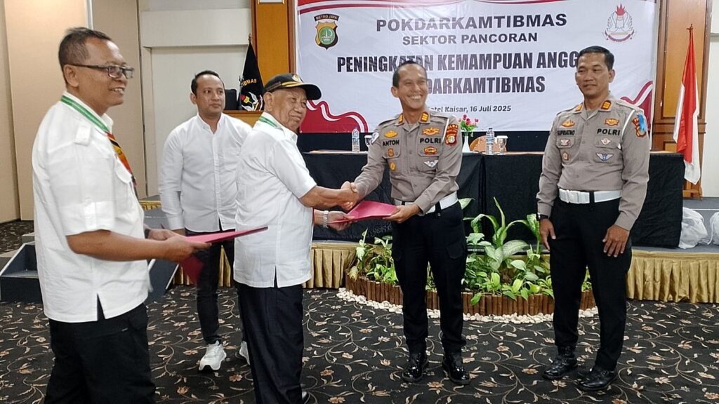 Jakarta Selatan – Kapolsek Pancoran, Kompol Mansur S.E,.M.M, bersama dengan unsur Tiga Pilar Kecamatan Pancoran, menghadiri kegiatan Peningkatan Kemampuan Pokdarkamtibmas Sektor Pancoran yang diselenggarakan di Hotel Kaisar, Kecamatan Pancoran, Jakarta Selatan. Kegiatan ini dilaksanakan pada hari Rabu, 16 Juli 2025, mulai pukul 08.00 WIB hingga selesai.