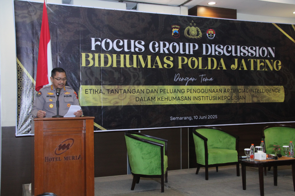 Jakarta. Bidang Humas (Bidhumas) Polda Jawa Tengah (Jateng) menggelar Focus Group Discussion (FGD) bertajuk “Etika, Tantangan dan Peluang Penggunaan Artificial Intelligence dalam Kehumasan Institusi Kepolisian” di Hotel Muria, Kota Semarang.