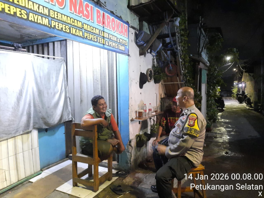 Jakarta Selatan – Dalam rangka menjaga keamanan dan ketertiban lingkungan, Bhabinkamtibmas Kelurahan Petukangan Selatan, Polsek Pesanggrahan, Aiptu Dasep Hidayat melaksanakan pemantauan kegiatan ronda malam warga di Jl. Damai RT 09/05, Kelurahan Petukangan Selatan, Kecamatan Pesanggrahan, Jakarta Selatan, Rabu (14/1/2026).