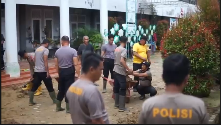 Sebagai bentuk kepedulian dan respons cepat terhadap kondisi tersebut, pada Senin (29/12/2025) personel Polres Langsa turun langsung ke lokasi memulai pembersihan. Dengan peralatan sederhana seperti cangkul, sekop, dan kereta dorong, personel Polri bersama para guru bergotong royong membersihkan lumpur di halaman dan ruang kelas agar sarana pendidikan dapat segera difungsikan kembali.