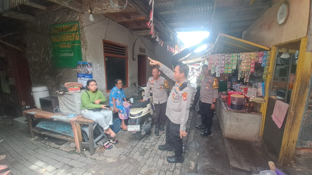 Bhabinkamtibmas Polsek Tebet melaksanakan kegiatan patroli jalan kaki di lingkungan pemukiman RW 04, Jalan Manggarai Utara II, Kelurahan Manggarai, Kecamatan Tebet, Jakarta Selatan, pada Sabtu, 3 Januari 2026.