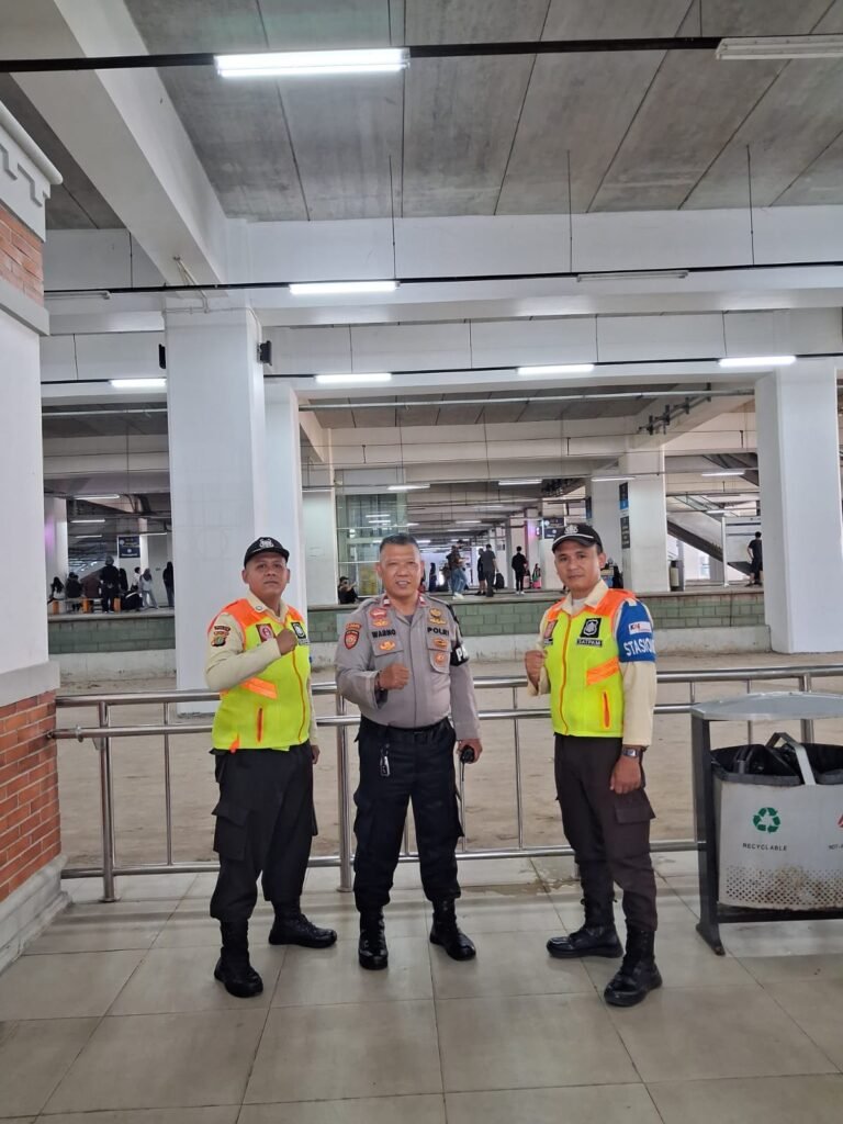 Personel Samapta Polsek Tebet, Polres Metro Jakarta Selatan, melaksanakan kegiatan patroli dialogis bersama petugas keamanan (security) ΚΑΙ Manggarai di kawasan Stasiun Manggarai, Jalan Manggarai Utara I, Kelurahan Manggarai, Kecamatan Tebet, Jakarta Selatan, pada Selasa, 30 Desember 2025, pukul 11.00 WIB hingga selesai.