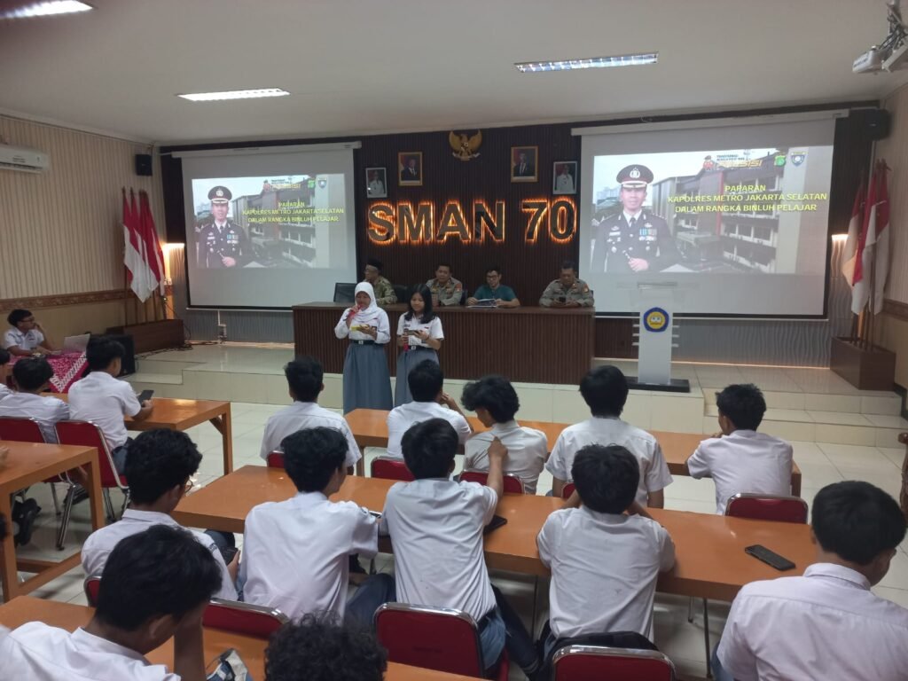 Kegiatan yang bertemakan “Kenakalan Remaja, Bahaya Narkoba dan Tawuran” ini dihadiri oleh Kasat Binmas Polres Metro Jakarta Selatan AKBP Doddy Ginanjar, A.Md., S.H., Wakasat Serse Kompol S. Dwi Manggala Yudha, Kanit Binmas AKP Imam Supriyadi, S.H., serta Bhabinkamtibmas Kelurahan Kramat Pela Aiptu Suratin. Turut hadir pula pembina OSIS SMA Negeri 70 Bapak Fachri mewakili pihak sekolah.