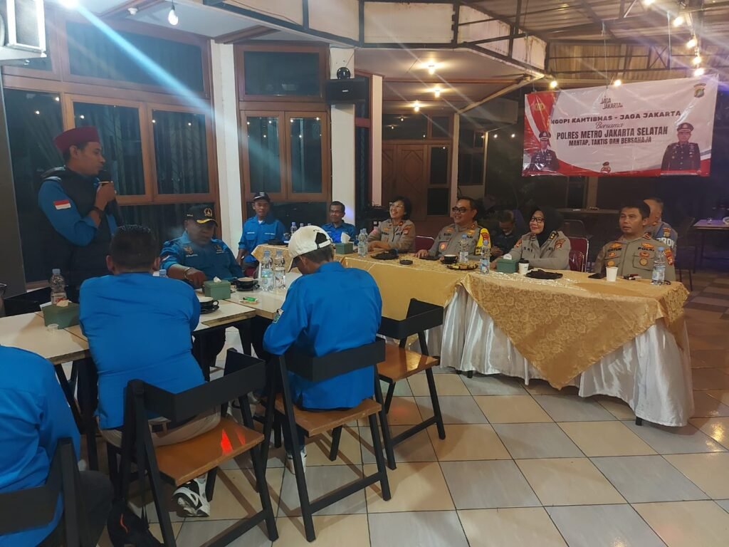 Jakarta Selatan, 6 November 2025 – Polres Metro Jakarta Selatan menggelar kegiatan Ngopi Kamtibmas Jaga Jakarta yang berlangsung di Aula Komplek PUPR Sapta Taruna, Kelurahan Pondok Pinang, Kecamatan Kebayoran Lama. Kegiatan yang dimulai pukul 19.30 WIB ini dihadiri oleh Kapolres Metro Jakarta Selatan Kombes Pol. Nicolas Ary Lilipaly beserta jajaran, unsur pimpinan Polsek Kebayoran Lama, dan para tokoh masyarakat serta warga RW 10.